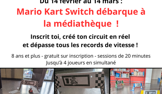 Mario Kart Switch à la médiathèque ! 14/02/2026 Médiathèque Mario Kart Switch est à la médiathèque ! Du 14 février au 14 mars Seul ou à plusieurs : créé ton ...