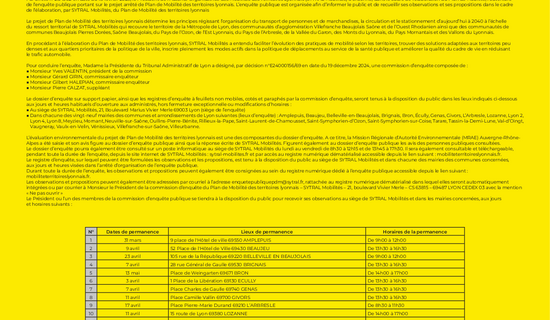 05/03/2025 Avis d'enquête publique Ouverture de l'enquête publique relative au projet de Plan de Mobilité des Territoires lyonnais. ...