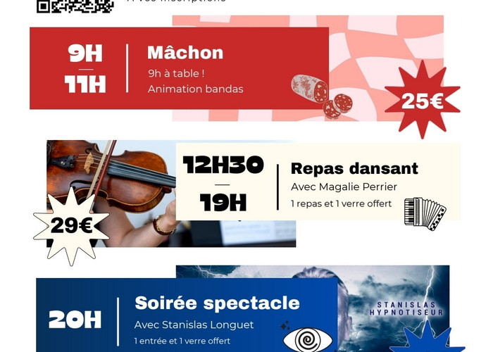 Au programme : 🍽️ Mâchon 🍲 Repas dansant 🌀 Soirée hypnose 💃🕺 Bal jusque tard dans la nuit